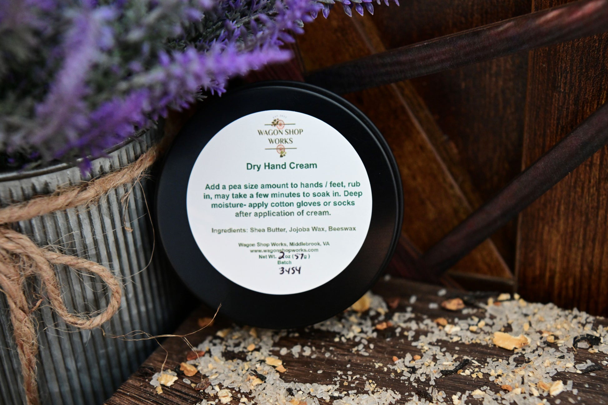 Dry Hand Cream comes in a 2 oz. black aluminum tin to preserve the quality of the product. The cream is heavy, use about a pea-size portion on your hands and feet at night. For a Deep moisturizing put cream on hands/feet and sleep in cotton gloves/socks. NO essential oils added. This cream doesn't contain any preservatives; therefore, shelf life is approximately 6-8 months. Store in cool location but not refrigerated.